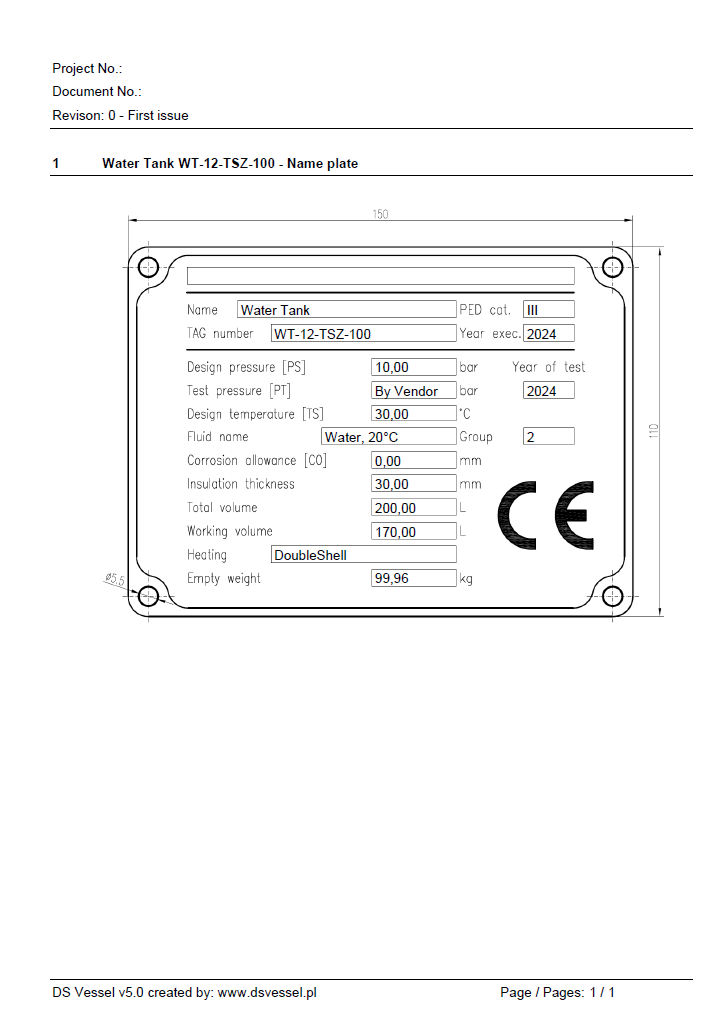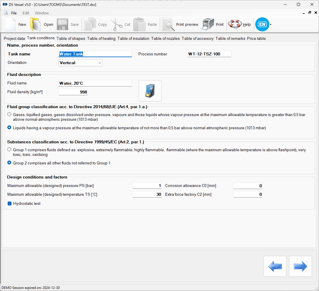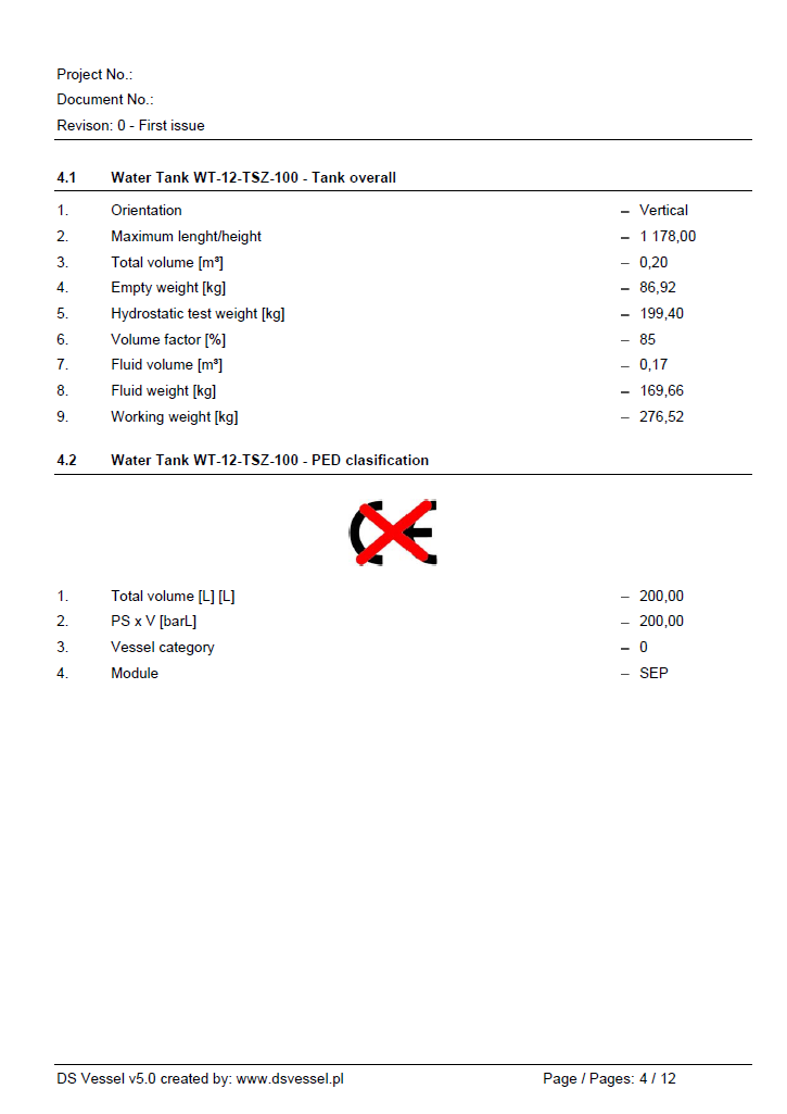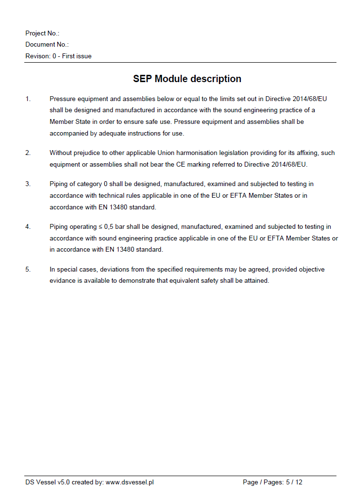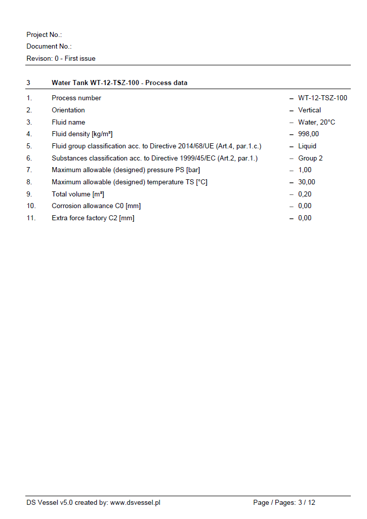 Program dokonuje oceny kategorii zbiornika zgodnie z Dyrektywą UE 2014/68/EU.